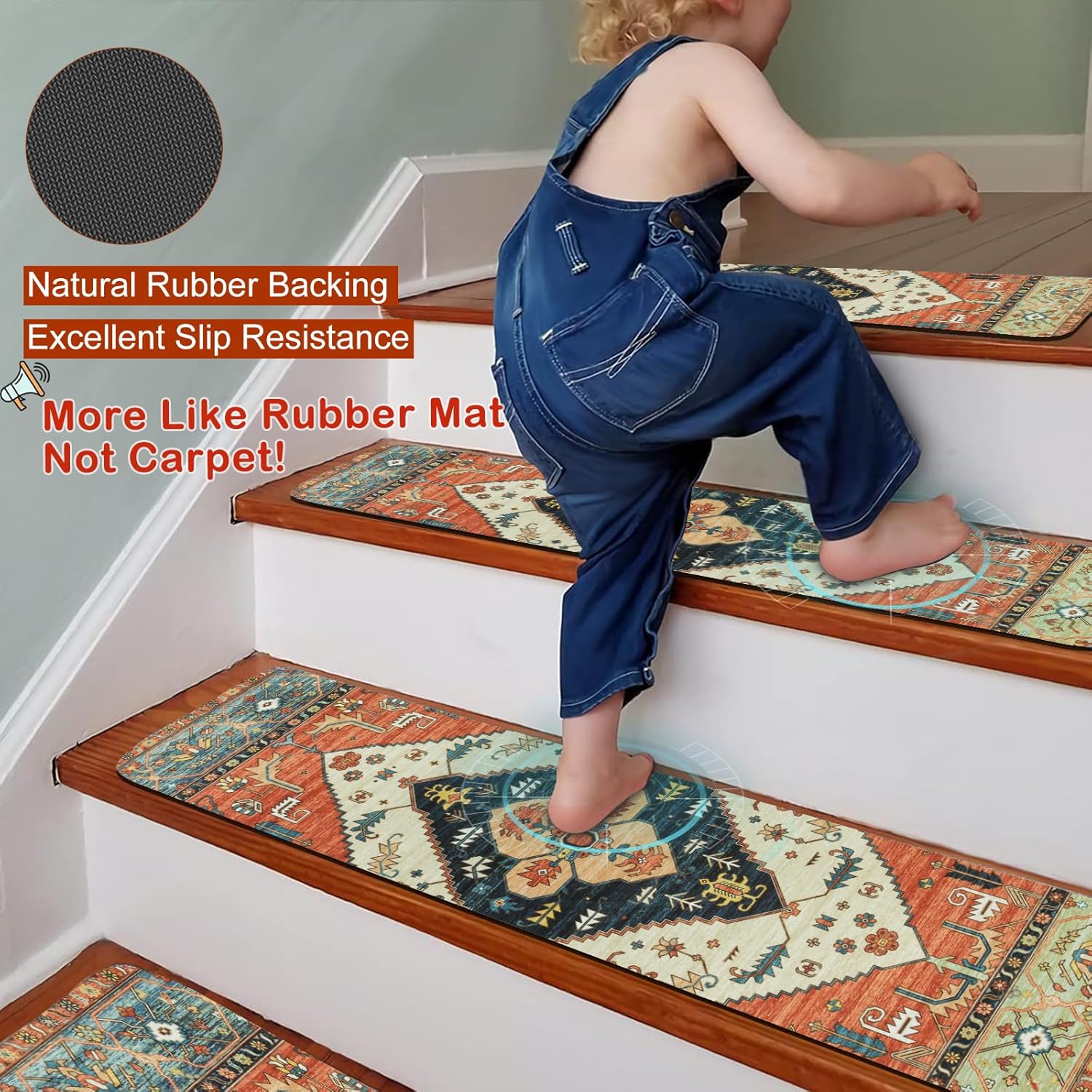 • Non-Slip Stair Mat: set of 15 anti-slip stair treads with rubber backing can be firmly attached to the ground, transforms any slippery staircase into a slip-free surface, protect the safety of you, your kids, your pets, and the elderly when you go up and down stairs. Notes: These stair treads are printed rubber mats, not carpets!
