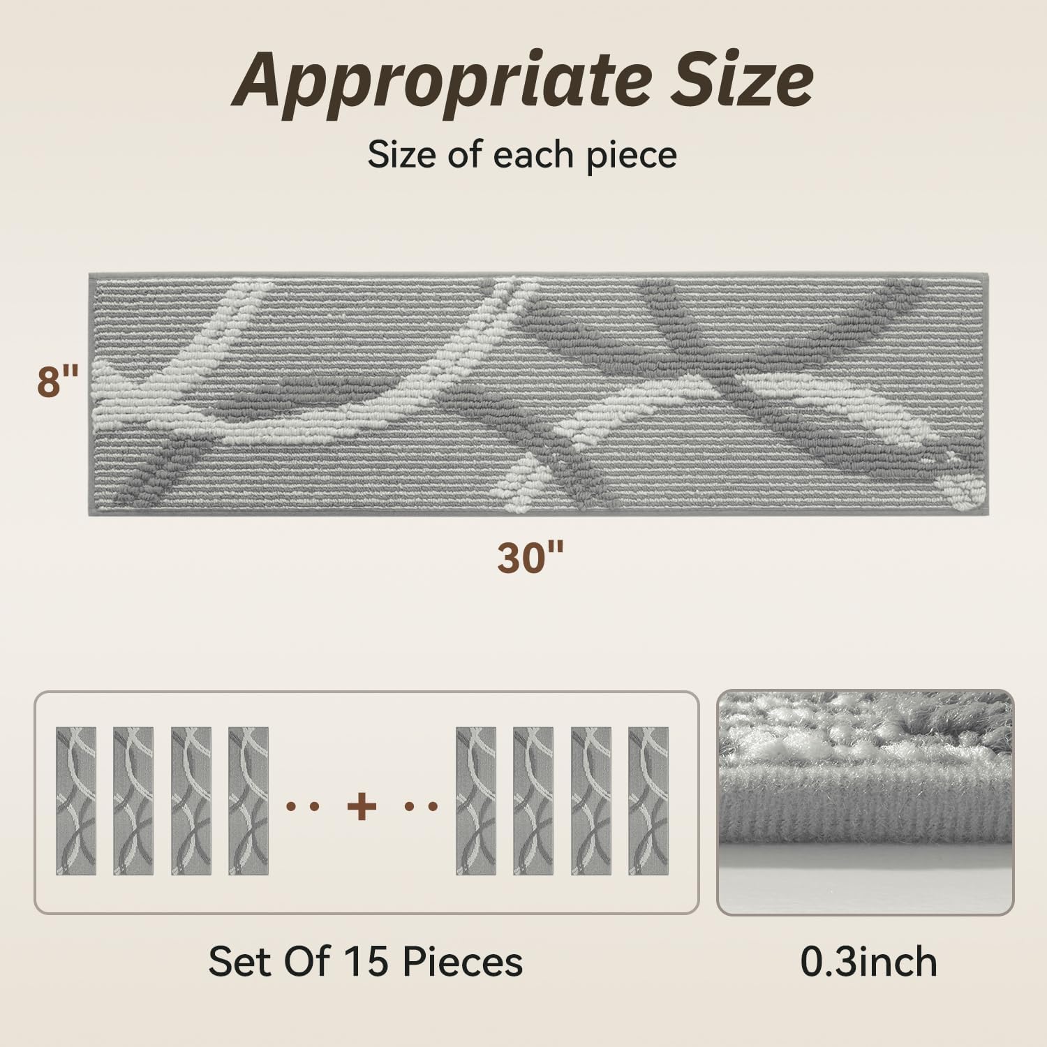 Stair Treads for Wooden Steps,15 Pack Peel and Stick Stair Treads Indoor,3D Adhesive Stair Runner for Kids,Elders and Pets, Washable Carpet for Stairs,8″x30″,Grey